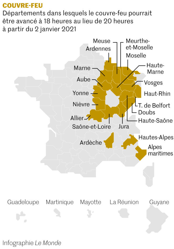 Продвинутый двухчасовой комендантский час, с 18:00 вместо 20:00, планируется со 2 января для территорий, наиболее затронутых эпидемией Covid-19, объявлено во вторник, 29 декабря, Министр здравоохранения Оливье Веран, гость «20:00» Франции 2. Он уточнил, что рассматриваемые территории являются «департаментами, мегаполисами (…), в которых уровень заболеваемости будет выше порога максимальная бдительность » .
