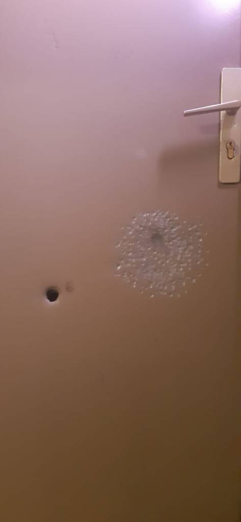 Ma femme a contacté une de ses amies. Son mari et son ami sont venus accompagnés de la police pour chercher mes enfants et ma femme pour les faire sortir en sécurité. Le soir, nous nous sommes rendus à Nantes car je devais travailler lundi matin. Le lundi, dans la matinée, quand j’étais au travail notre voisine d’en face nous a envoyé une photo de notre porte: les dealers avaient tiré dans notre appartement, la balle avait transpercée notre porte d’entrée en recachetant le sol ainsi que la porte de la chambre des mes deux petits fils.